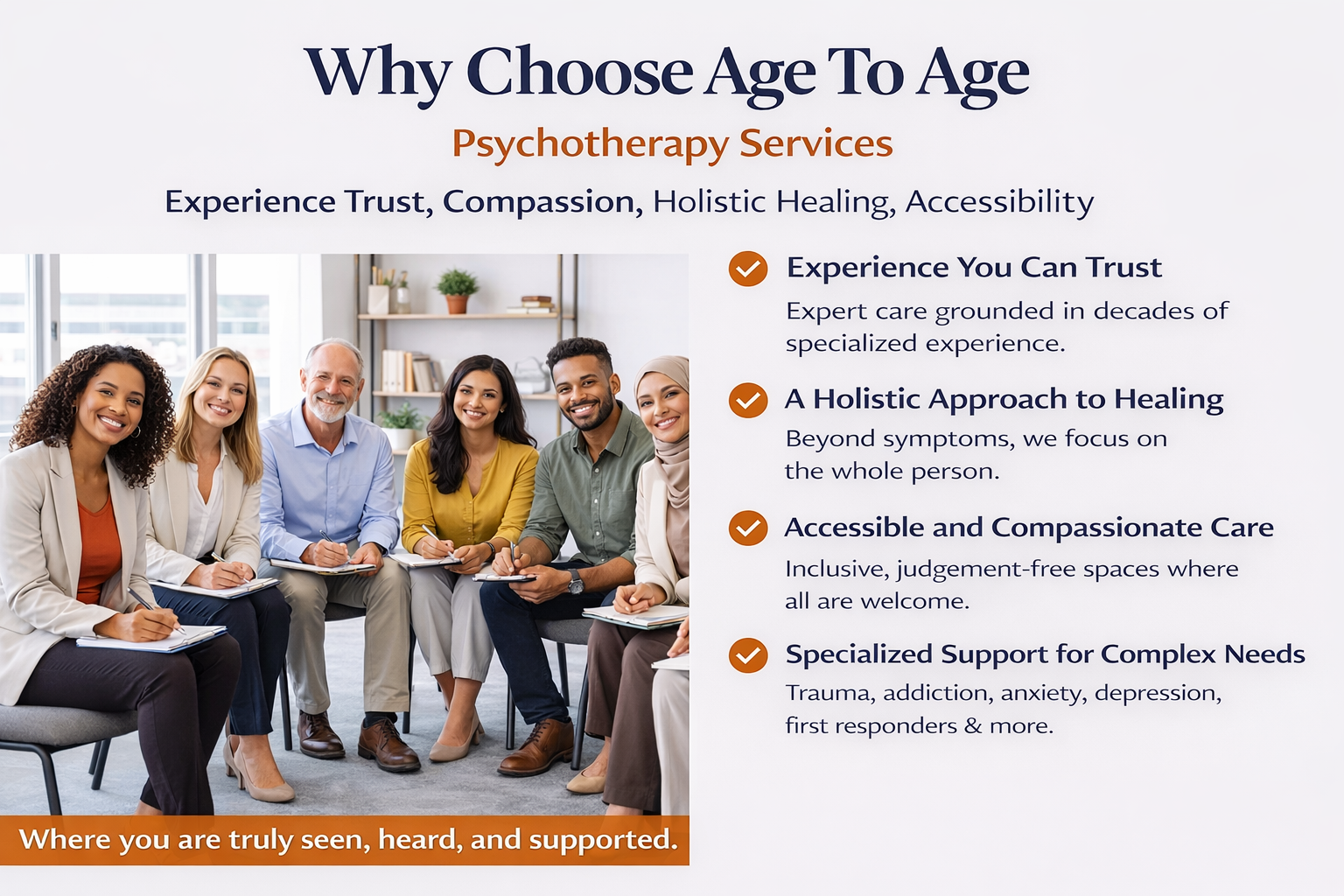 At Age To Age, you are not just another appointment. You are a person with a story, a purpose, and a future. We walk alongside you with respect, empathy, and a commitment to help you move forward.